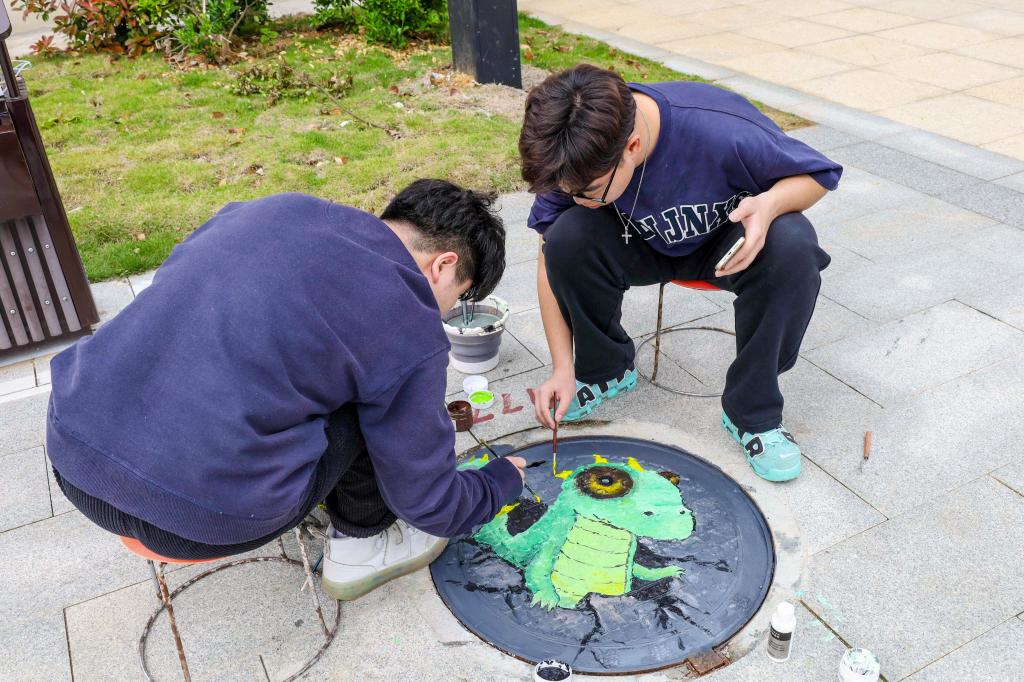 短短两天时间,150余位员工积极创作,用34幅创意井盖画为校园环境添上绚烂一笔。美术学专业2021(4)班的谢鑫一听说活动就召集队伍报名参加了,“这个活动很有意义,当我们完成作品的那一刻,真的成就感满满。”他说,画井盖画不仅锻炼了自身专业能力,还美化了校园环境,“如果以后还有这种活动,我一定要参加。”