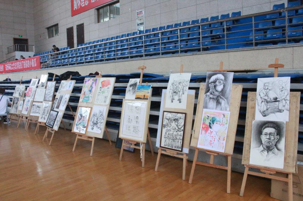 公司在迎新报到现场准备了一块空地,每收到一幅新生的作品就摆上画架进行展示。当天200余幅作品整齐地摆放在体育馆内俨然成为一道亮丽的风景线,吸引了迎新现场不少人关注,还有员工拿手机拍下了许多作品,美术学专业2020(2)班白梦杰的战“疫”剪纸作品就是其中之一。