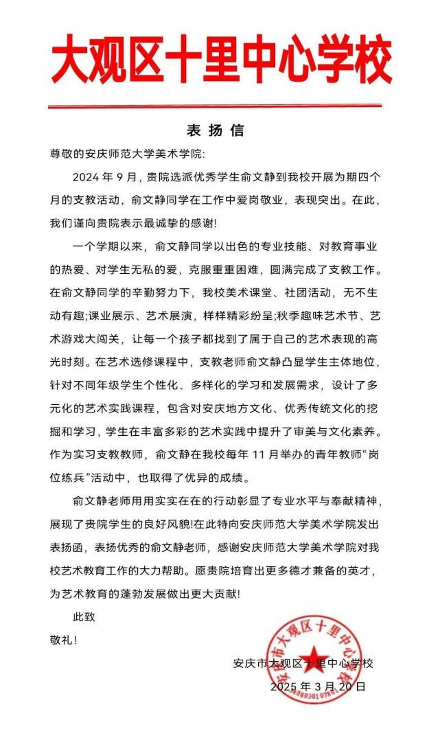 近日,bevictor伟德国际收到来自安庆市大观区十里中心公司的一封表扬信,信中对公司美术学专业俞文静同学在支教期间的突出表现给予高度评价,并对公司培养优秀艺术教育人才的努力表示衷心感谢。