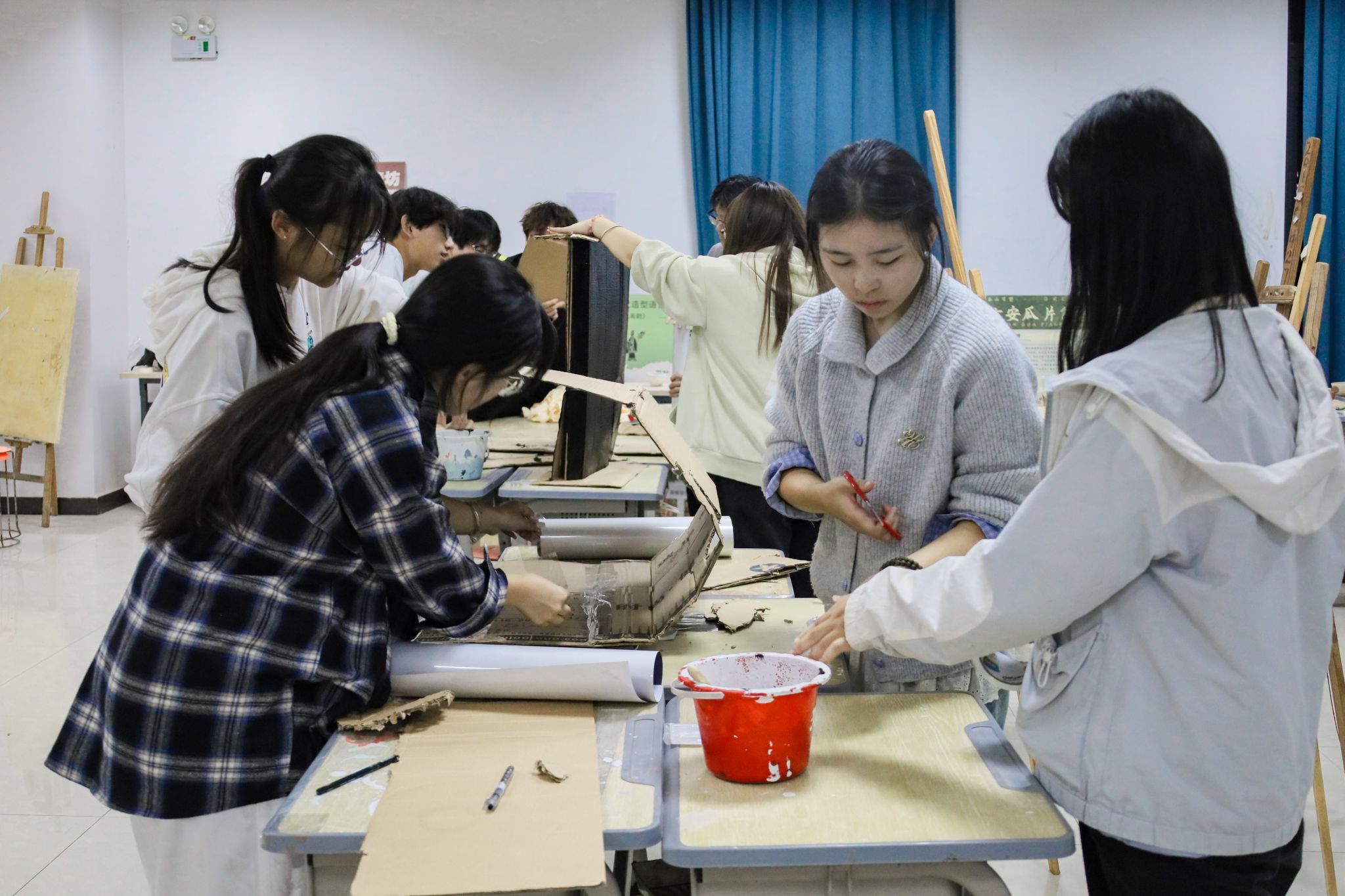 挑选纸箱、裁剪、调配颜料……志愿队成员们在道具制作中分工明确。“我主要负责刷颜料,虽然会不小心弄一身,但看到作品一点点成型,特别有成就感。”设计学专业2025(2)班的严长胜说。大家小心翼翼地调整纸箱尺寸,反复比对确保合身。颜料难干,他们便用纸板扇风、刮去多余颜料,齐心协力完成制作。这些精心打造的道具不仅展示了bevictor伟德国际的创意,更体现了他们的实践精神和团队协作。