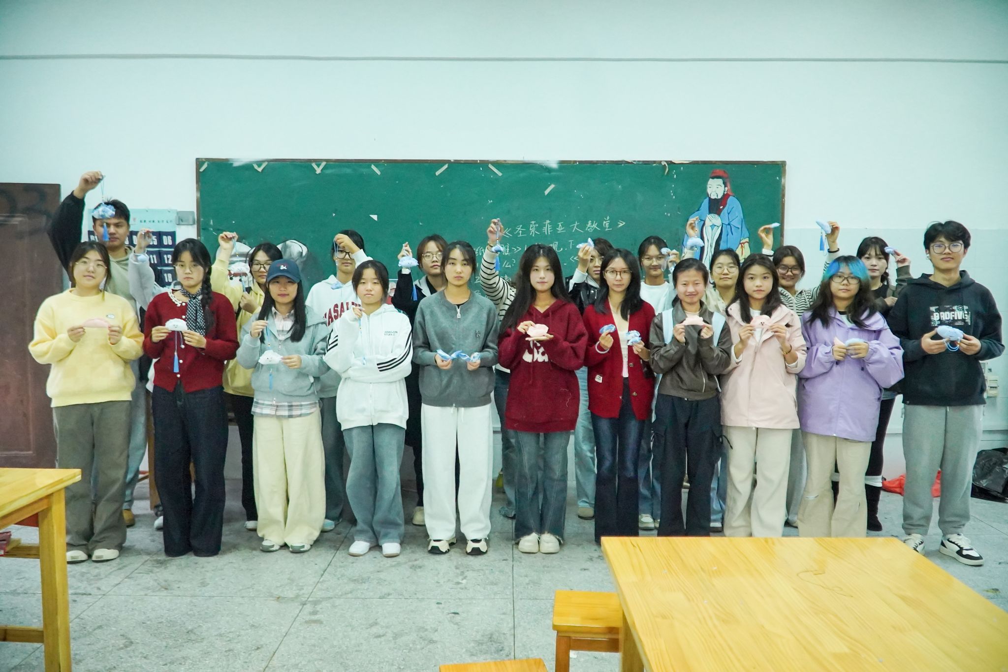 活动伊始,动画专业2024(1)班的叶意雯早早守在操作台前,化身“小老师”,手把手带着参与员工拆解每一步操作。“大家可以按自己的喜好定‘饺子’大小,先用圆规在布上画圆裁剪,对折后塞进棉花当‘馅’,再顺着饺子的折痕细心缝好就成啦!”她演示穿针技巧的同时,还提醒大家缝折痕时要贴边走,这样“饺子”才会更立体。在其细致指导下,同学们们埋头穿针引线,不时互相请教针法、交流心得,在专注的创作里感受动手的乐趣。