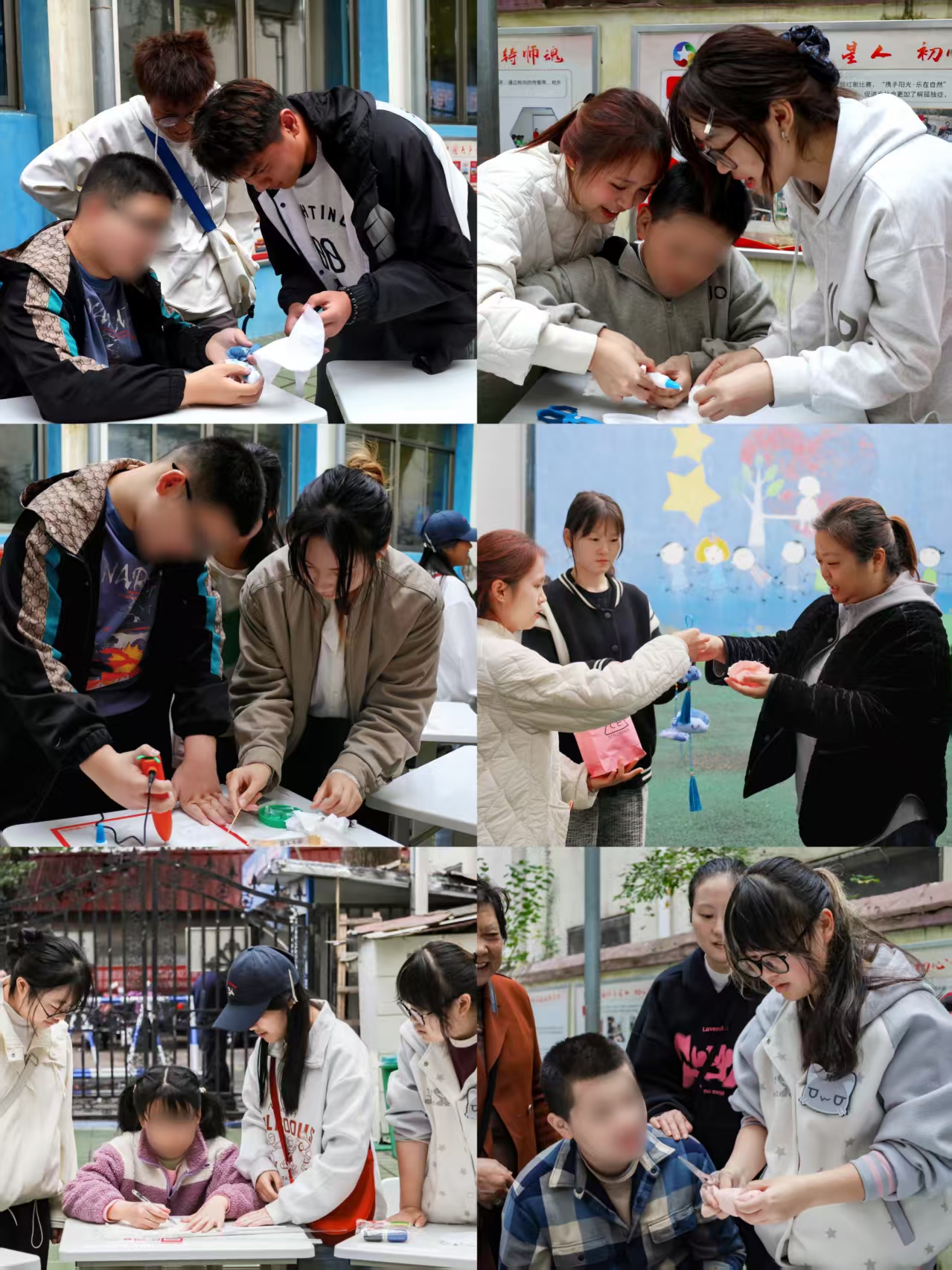 “我们希望打破传统公益单一模式,让传统文化传承与爱心帮扶双向赋能。”“弘美”志愿服务队负责人、美术学专业2024(2)班的方晓茹介绍,联合扎染俱乐部与美工坊开展活动,正是看中了专业力量能让非遗体验更具深度。为兼顾特殊儿童的安全与操作能力,前期筹备时,团队改编了简化版扎染工艺,既保证安全性,又能让孩子们轻松体验创作乐趣,并特意准备布料专用胶替代针线,消除针线使用的安全隐患。同时,志愿者们还规划好现场布局,将桌椅摆放在室外围成一圈,把材料工具整齐陈列,用细节彰显对孩子们的用心。