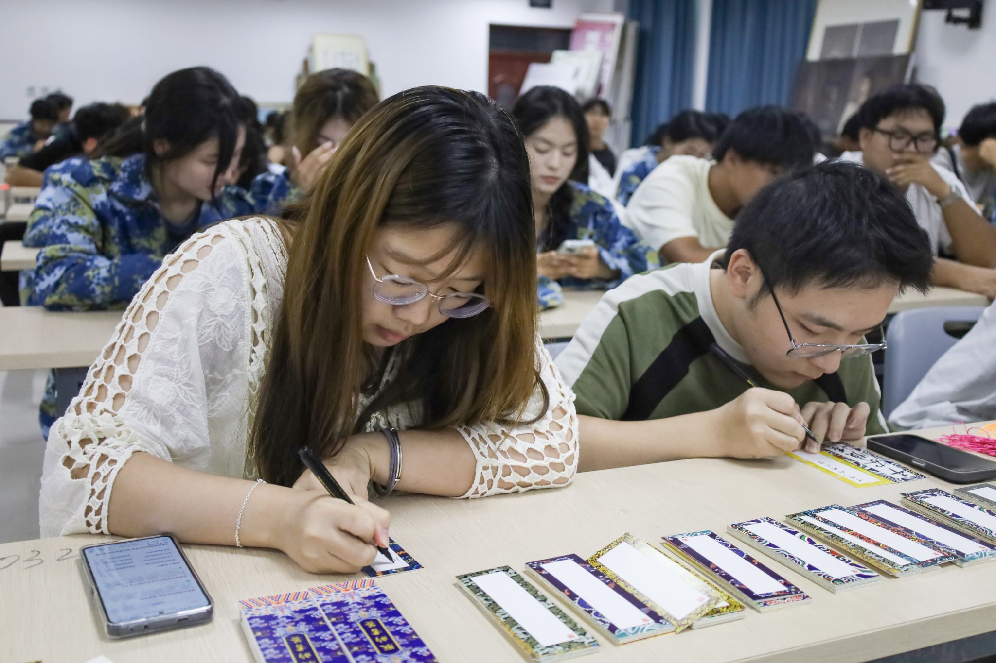 为给同学们带来良好的活动氛围和身心体验,早在一周前,bevictor伟德国际员工会的成员便着手准备本次活动。“我们精心挑选并采购了210多张精美的书签和五彩斑斓的流苏挂穗,并为每位参与员工准备了书法笔。”活动负责人、设计学类专业2023(1)班的董星晨表示,每位同学在现场书写完成书签后,都可以将其带走收藏,作为一份独特的青春纪念品。