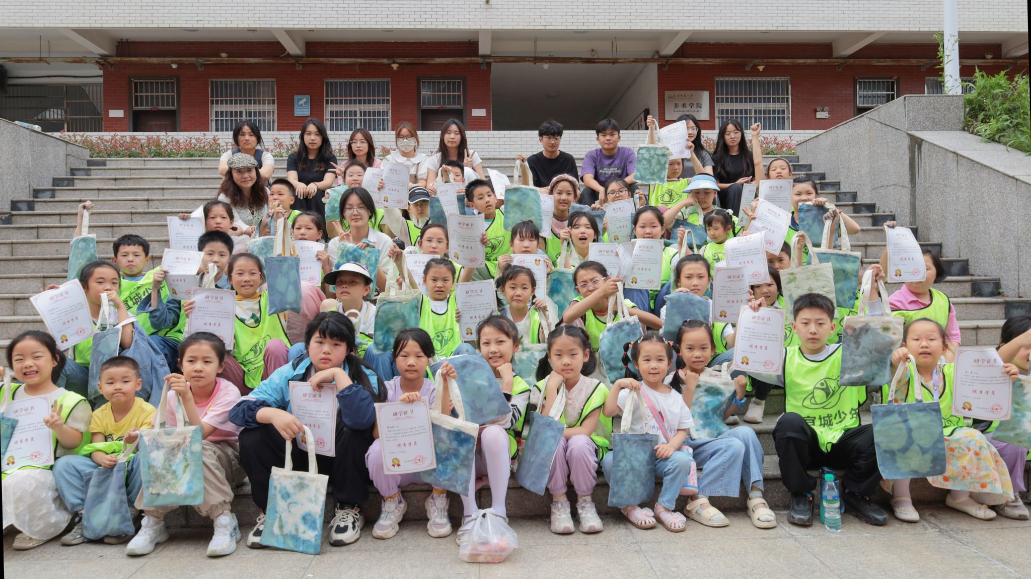 前置步骤处理完成后,志愿者们组织各组成员将帆布包统一放置在公司旁边的草坪上进行晾晒。随着时间的推移,植物的轮廓逐渐在帆布包表面显现,独一无二的影像便被留存在布料上。在晾晒完成后,为给手工帆布包增添更多的色彩,小朋友们跟随志愿者学习拓印技术,将植物的色彩与形状印在帆布包的另一面。