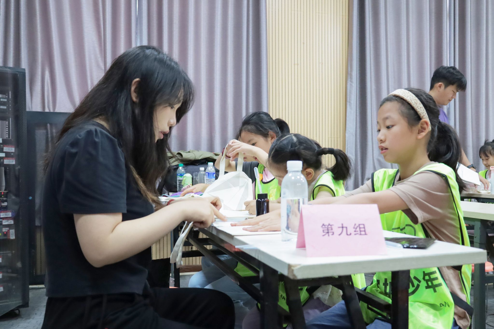 将柠檬酸铁铵溶液和铁氰化钾溶液按比例配置好,用溶液涂满帆布包的正面,挑选喜欢的树叶与花瓣固定在帆布包表面,在美术学专业2023(2)班的周慧的帮助下,第二组的四位小朋友顺利完成了晾晒前的几个步骤。“蓝晒工艺步骤繁琐,具有一定的难度,但孩子们在过程中都很配合,作品搭配富有创意。”周慧表示,这是她首次一人带着四位年龄较小的儿童制作手工,小朋友们的配合让她感到十分惊喜。