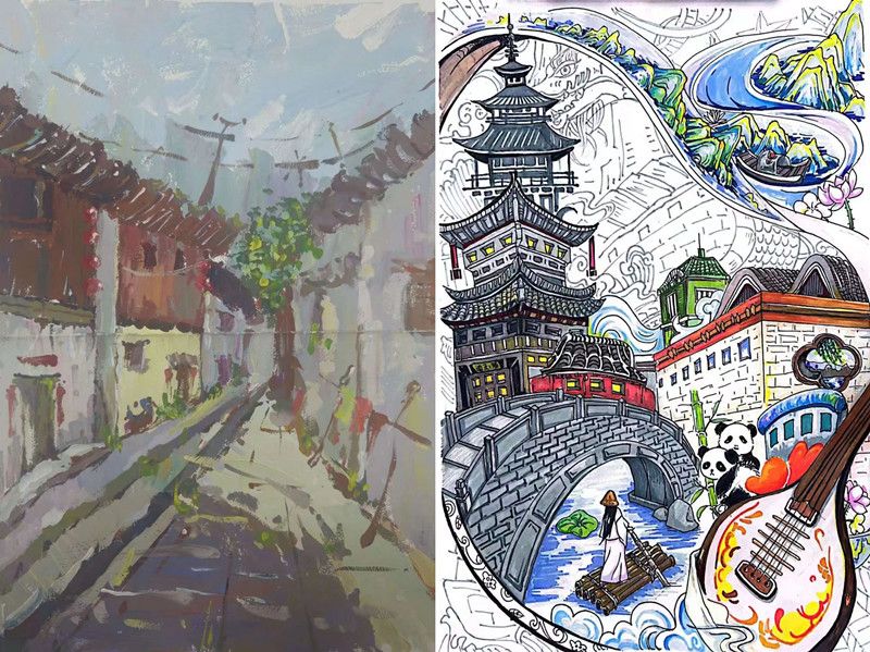 青砖绿瓦尽显乡镇风采,绿树蓝天反映良好生态,大红灯笼展现淳朴乡风……美术学专业2020(2)班的邵蓉蓉以乡土文化为切入点,以水粉绘制青山环绕、溪水潺潺的美丽中国画卷。“国家一直以来大力推行乡村振兴战略,乡村是中国的根脉,是我心中美丽中国的标志性风景。”她表示,希望我们的祖国更新更美、人民安居乐业。