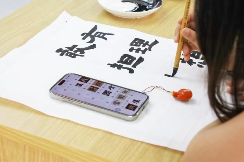 铺开白纸、研墨提笔,与会人员围坐在会议桌前,以书法创作形式深入感悟习近平总书记青年寄语。美术学专业2021(2)班员工党员卞鑫现场临摹邓石如隶书字体,写下了“有理想、敢担当、能吃苦、肯奋斗”十二个字,她收起笔墨时感慨道:“作为新时代老员工,我们应坚定理想信念,将小我融入大我。”