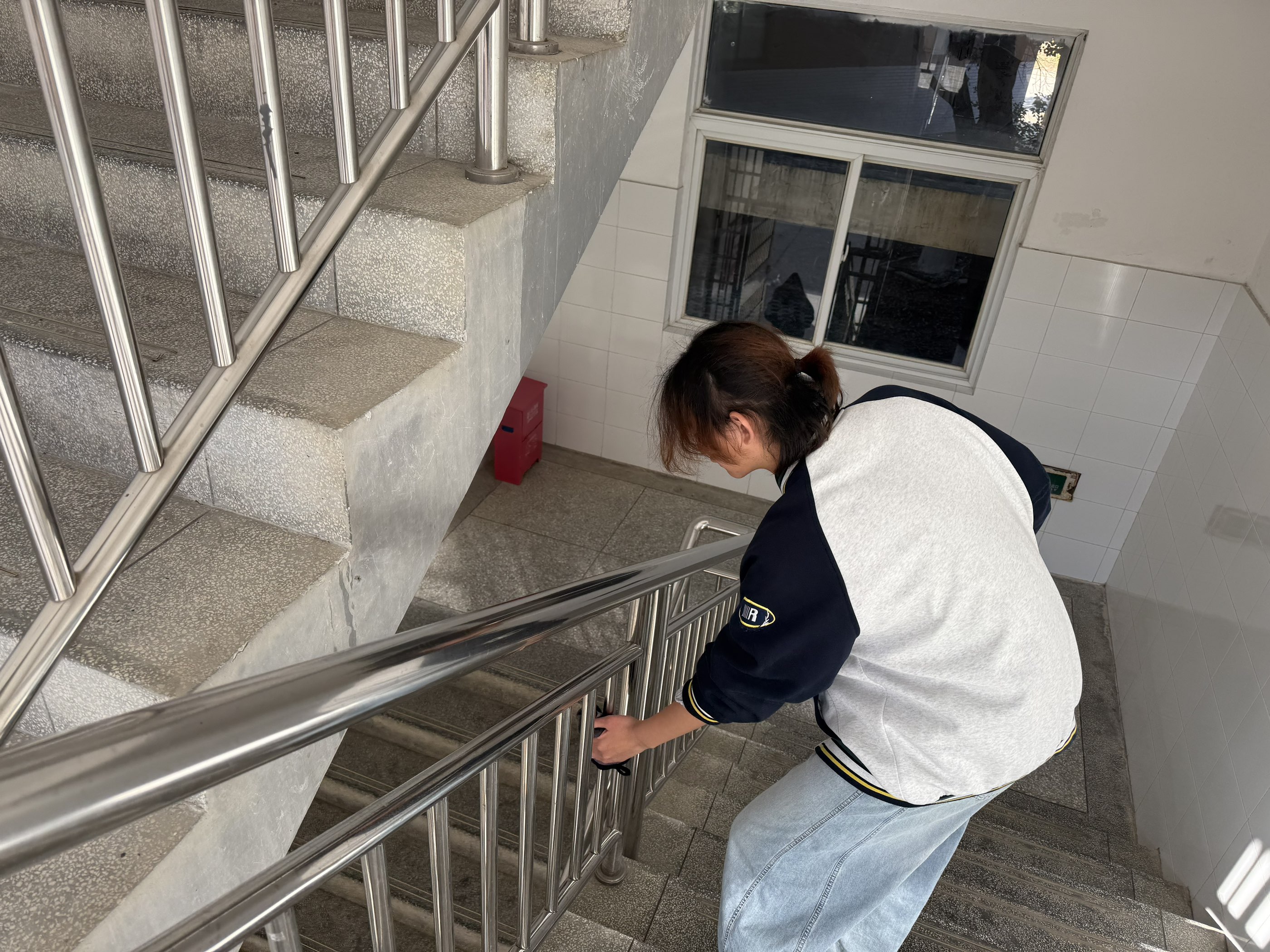 活动开始,参与活动的美院学子们陆续抵达活动地点,员工会工作人员引导员工组队,同时也特别强调有关清洁过程中的安全注意事项,确保每位参与者都能在安全前提下开展劳动。在领取完工具后,大家前往各自的清洁区域,一场充满活力的教室玻璃清洁行动正式拉开帷幕。负责一楼的小组成员们相互配合,一人用沾有清洁剂的抹布擦拭玻璃表面,一人手持玻璃刮自上而下刮去污水,配合十分默契。在二楼教室的窗沿角落,同学们蹲在窗边用小刷子清理缝隙里的积灰,再用湿抹布反复擦拭,不放过任何一处卫生死角。