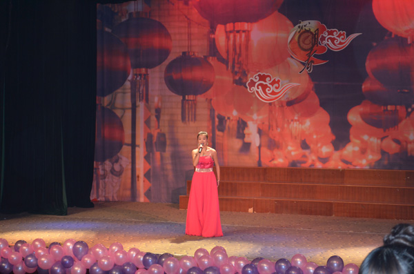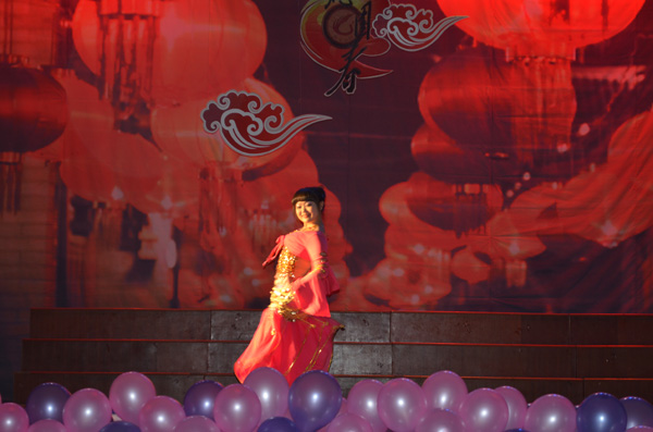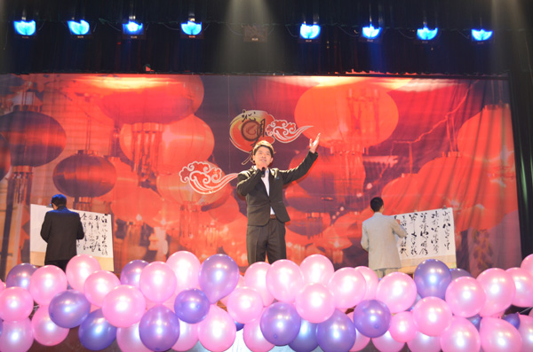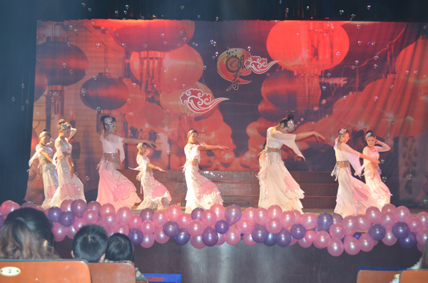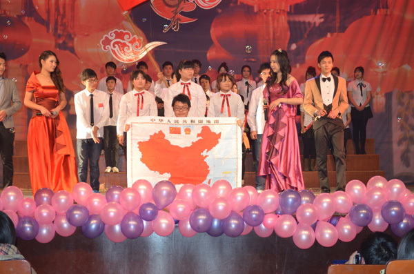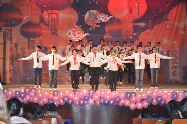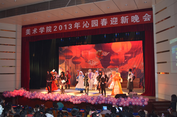 伴随着动感的开场舞《江南style》,晚会正式拉开了序幕。恢弘大气的诗朗诵《沁园春·雪》登上舞台,节目采用了一人朗诵两人进行书法表演的形式,不仅完美的契合了晚会的主题,更是展现了美院员工的专业特色。未见人,先闻声,在一阵叮咚的流水声后,灯光乍现,由夏艳等同学带来的舞蹈《嬉水》带给观众惊艳的视听感受,而cosplay真人秀表演更是引得动漫迷们尖叫连连,现场的掌声和欢笑不断,将晚会推向了第一个高潮。《change》、《肚皮舞》和《机械舞》3支各具特色的舞蹈闪亮登场,演员们高难度的技巧动作,丰富的肢体语言表达,令现场同学们赞叹不已。歌曲《因为爱情》男女深情对唱,更是让观众心中涌起一阵阵暖流。唯美的舞蹈《画中仙》,让现场观众们如临仙境,更是体现出美院学子的多才多艺与青春活力。小品表演《飞机场的那点事》将本次晚会推向了第二个高潮,演员们夸张的肢体动作与丰富的表情,逗得现场观众放声大笑。具有浓郁安庆特色的黄梅戏《到底人间欢乐多》,让大家充分感受黄梅戏的魅力和风采。 “在世界的国,在天地的家,有了强的国,才有富的家……”手语表演《国家》让广大同学们体会到了美院这一大家庭的温暖,歌颂了对祖国的无限热爱,同时也唱出了广大同学对党的十八大所描绘的美好生活蓝图的期盼。晚会结束后,出席晚会的领导、老师和嘉宾上台与全体演职人员合影留念。