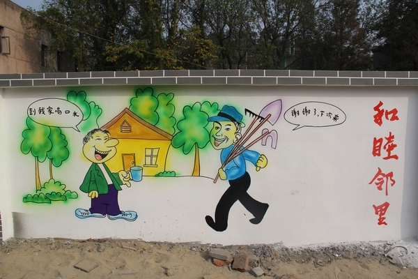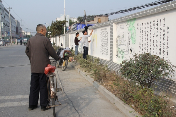 刘青是该工作室的一名党员骨干,是公司2010级美术学专业的员工。他告诉我们,他一直热爱绘画,尤其是墙绘,在大学这近四年的时间里,他利用课余时间潜心钻研,希望通过墙绘的方式去传播美德、传播文明。王凯旋是公司2011级动画专业员工,是墙体彩绘工作室的业务骨干。他告诉我们自己做墙绘已经很长时间,原来是一个人一边学一边做,感觉做很累,而且效果不是特别理想。后来,几个有同样兴趣的同学凑在一起,在一起交流切磋,并对外承接一点业务,来解决一点自己的生活费。我们希望会有更多感兴趣的同学加入这个团队,一起交流学习,一起提升专业技能。