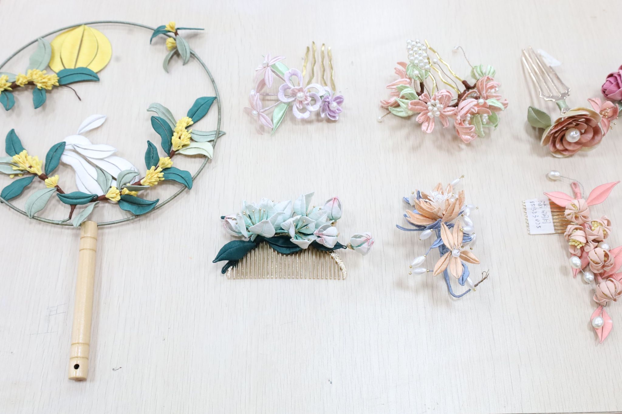 色泽莹润的缠花花束、独具一格的团扇、古韵十足的发梳……在作品展示区,十余件缠花作品整齐地排列在长桌上,华美的造型引得一众员工驻足“打卡”。此外,公司缠花俱乐部的几位“小老师”带着材料来到现场,等待为有兴趣体验缠花制作的员工提供一对一教学。